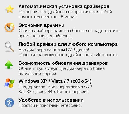В том числе содержит бесплатные драйвера для ноутбуков: Asus, Acer, Sony, Samsung, HP, Lenovo, Toshiba, Fujitsu-Siemens, DELL, eMachines, MSI...